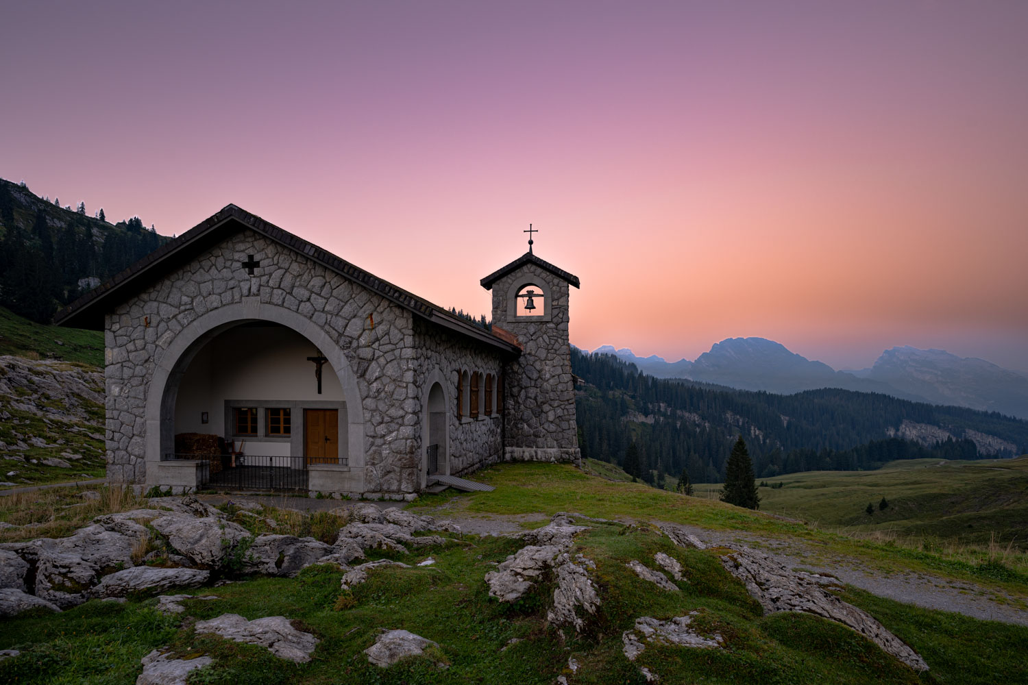 Zugegeben. Es ist für mich nach wie vor die Königsdisziplin und vor allem immer wieder aufs neue faszinierend und einzigartig: Das Beobachten, Verfolgen und Festhalten der Milchstrasse. Oder genauer gesagt, das Zentrum der Milchstrasse, wie sie für uns sichtbar ist. Die stetig zunehmende Lichtverschmutzung, sowie die stetig wachsende Anzahl an Störfaktoren im Himmel wie Satelliten, Flugzeuge und dergleichen machen diese Übung nicht leichter. Es war schon sehr spät, als ich in der Dunkelheit die Passhöhe erreichte. Alles war dunkel. Als ich ausstieg dauerte es nur ein paar wenige Augenblicke bis ich all die Sterne sah. Die Luft war klar, und trotzdem es noch Sommer war, merkte spürte ich die Kälte schon merklich. Doch da stand sie; die kleine Kapelle vom Pragelpass. So klein, und doch so gross. Mindestens wirkt sie so ;-). Im Innern der Kapelle verleihen mehrere Lichtquellen dem Bild seinen warmen und gemütlichen Touch.