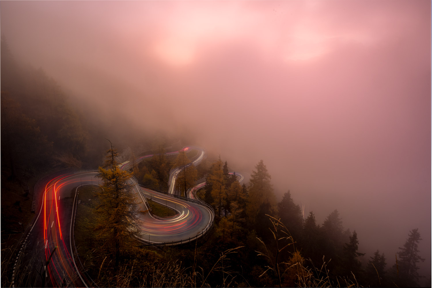 Oder auch Lichtspuren. So nennt man es wenn sich die Scheinwerfer der Autos in rote und weisse Schlangen verwandeln. Das funktioniert natürlich nur, wenn es dunkel ist. Hierbei sind verschiedene Techniken anzuwenden. Je nach dem was man mit dem Bild aussagen möchte. Für mich ist dieser Spot immer wieder aufs neue extrem spannend. Die sehr kurvenreiche Strasse, die sich um den Malojapass schlängelt. Es sind unzählige Möglichkeiten vorhanden, dem Bild einen Ausdruck zu geben. Sei es bei Tag, im Nebel, in absoluter Dunkelheit und vor allem bei sternklarem Himmel.