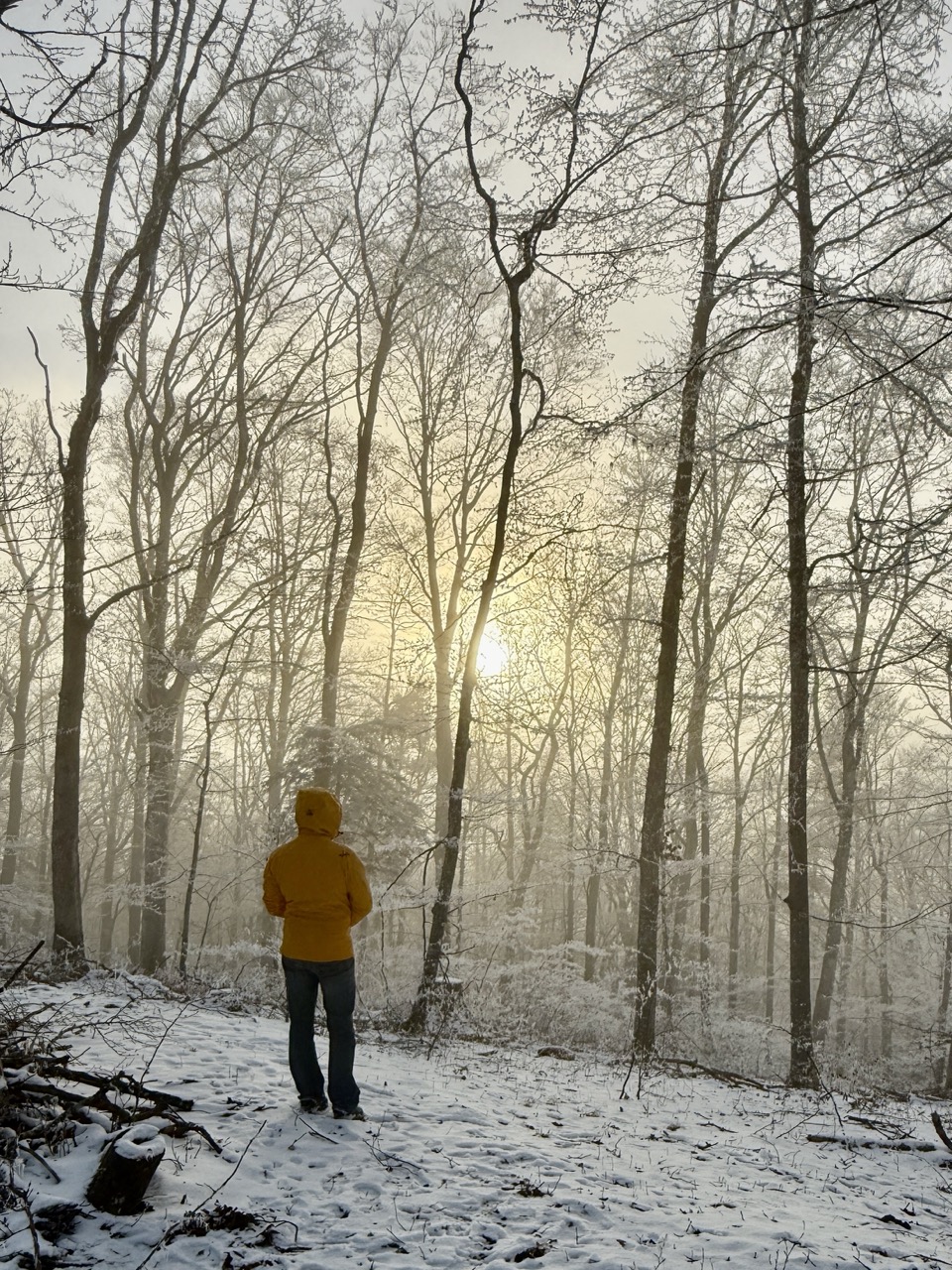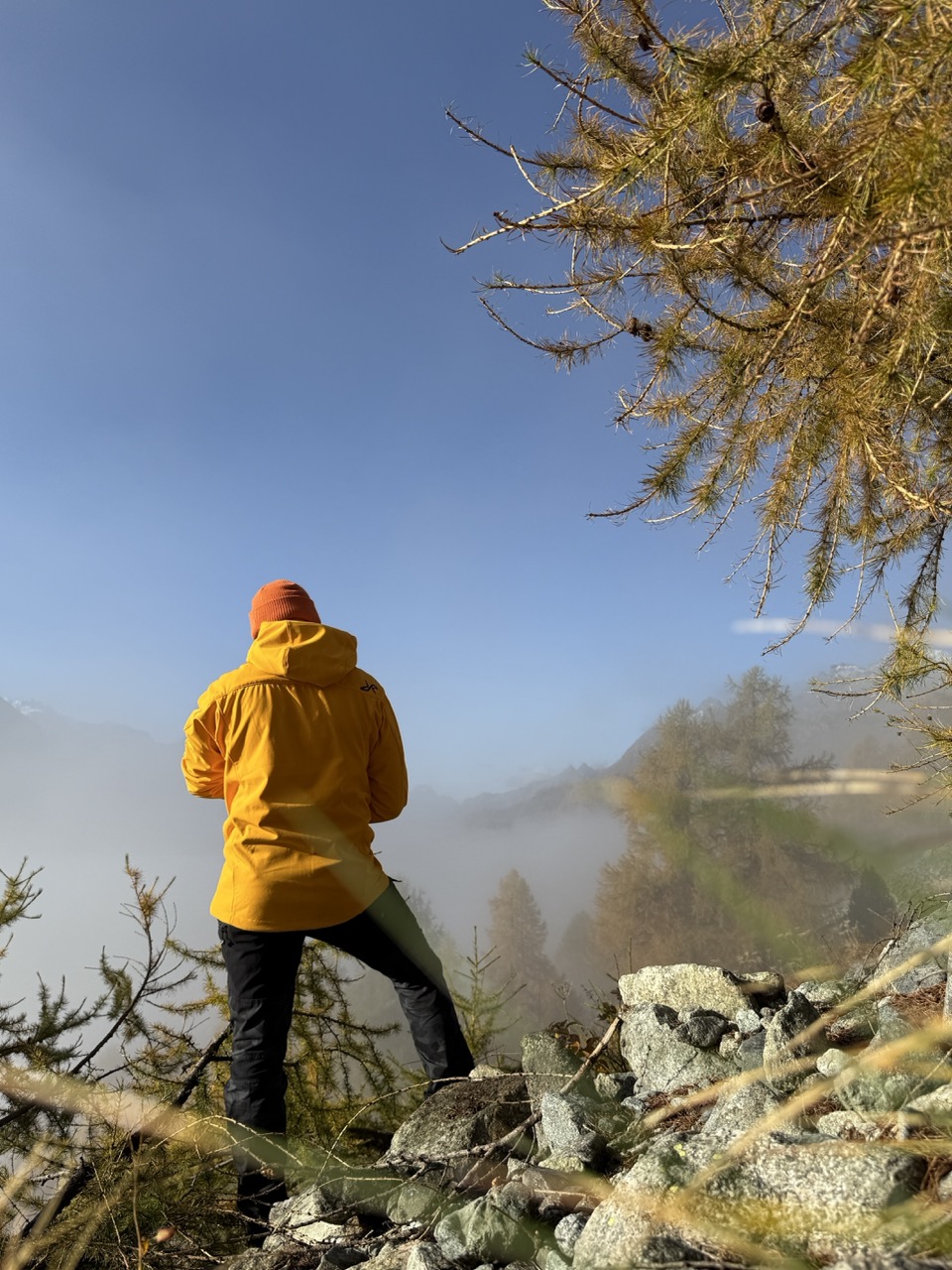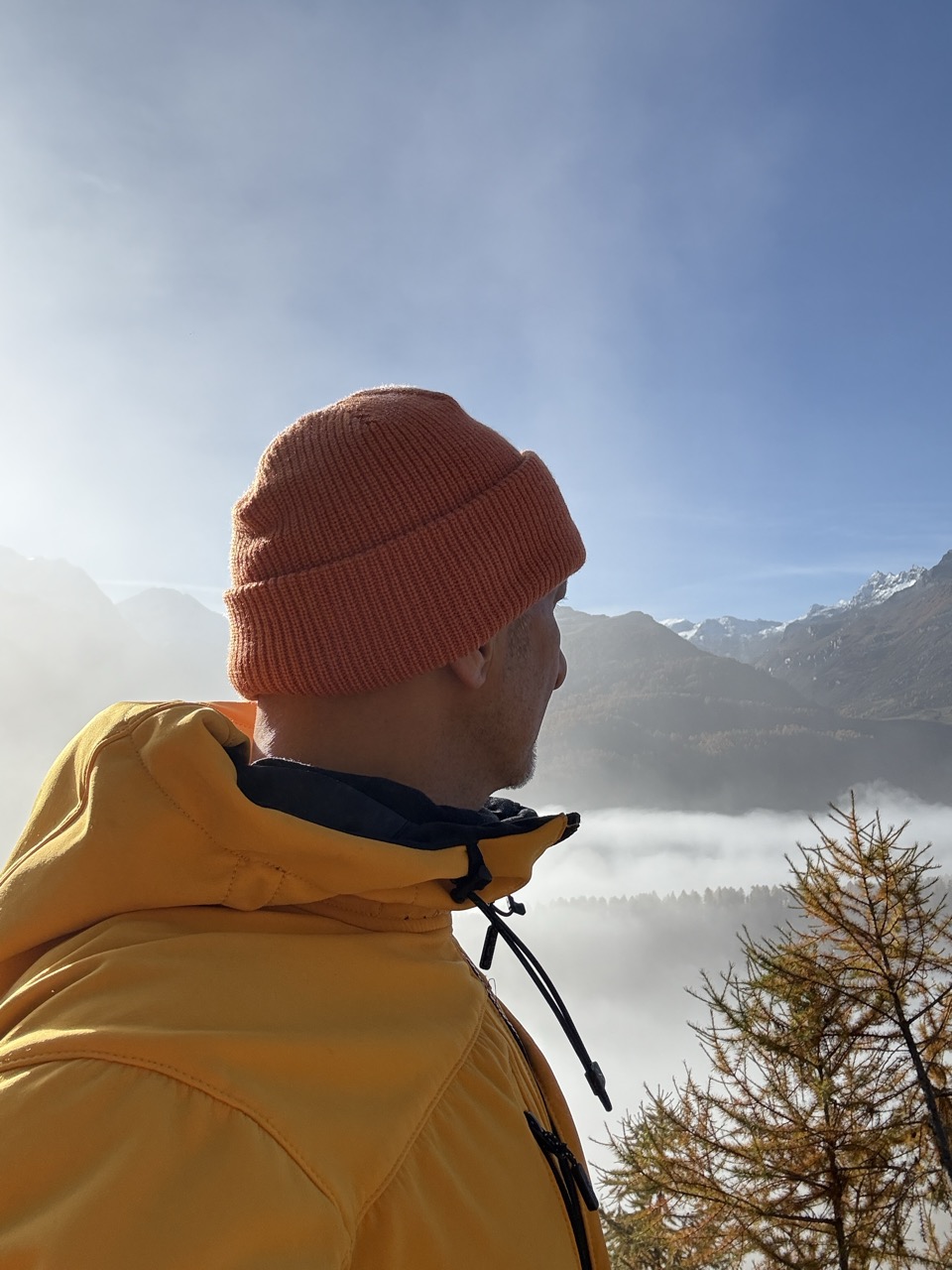 Endlich! Aber erst ..... Als ich aus dem Fenster schaute, sah ich nicht viel. Dicker Nebel hüllte die Umgebung in ein tiefes grau. So dicht, dass man kaum die eigene Hand vor Augen sah. Mein Gedanke: Vielleicht klappt es. Also war bereits Stress angesagt. Positiver Stress, wohlgemerkt. Schnell zog ich mich an und fuhr los. Von meinem Standort waren etwa 15 Minuten zu fahren. Auto geparkt, Jacke und Handschuhe angezogen. Und dann hiess es, den steilen Hang hinauf jagen. Wie so oft, ein Wettlauf gegen die Zeit. Ich musste die Nebelgrenze vor Sonnenaufgang erreichen. Als ich dann bei der Nebelgrenze war, die Situation abschätzte und weiter hinauf blickte war klar... ich muss noch viel weiter hinauf. Also noch einen weiteren Spurt hinlegen. Hier führt kein Weg hinauf. Der Untergrund ist meist lose. Jeder Tritt muss sitzen. Die Zeit drängte. Und dann war er da. Der für mich perfekte Moment. Die Gipfel wurden von den ersten Sonnenstrahlen angeleuchtet. Das Nebelmeer wechselte vom kühlen blaugrau in ein sanftes gelbgold. Was für ein Augenglick! Nun heisst es das "perfekte" Foto schiessen. Dann den Moment geniessen wenn die Sonne auch mich mit ihren Strahlen wärmt.