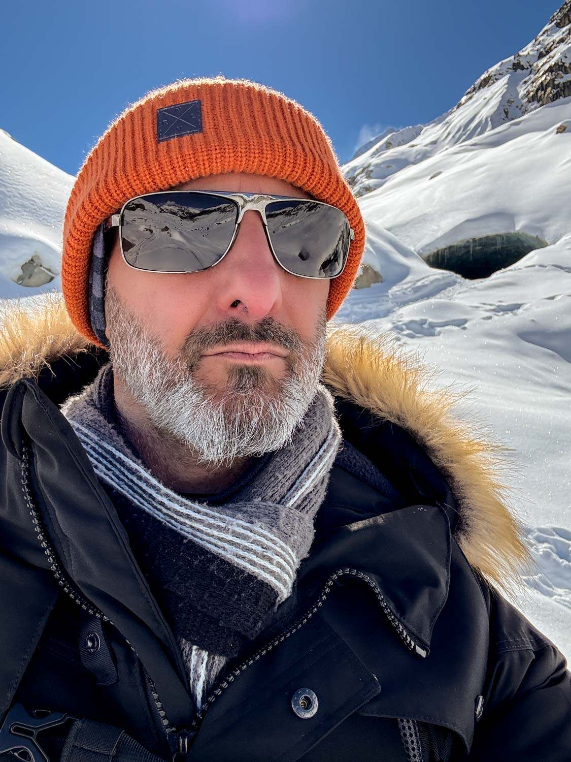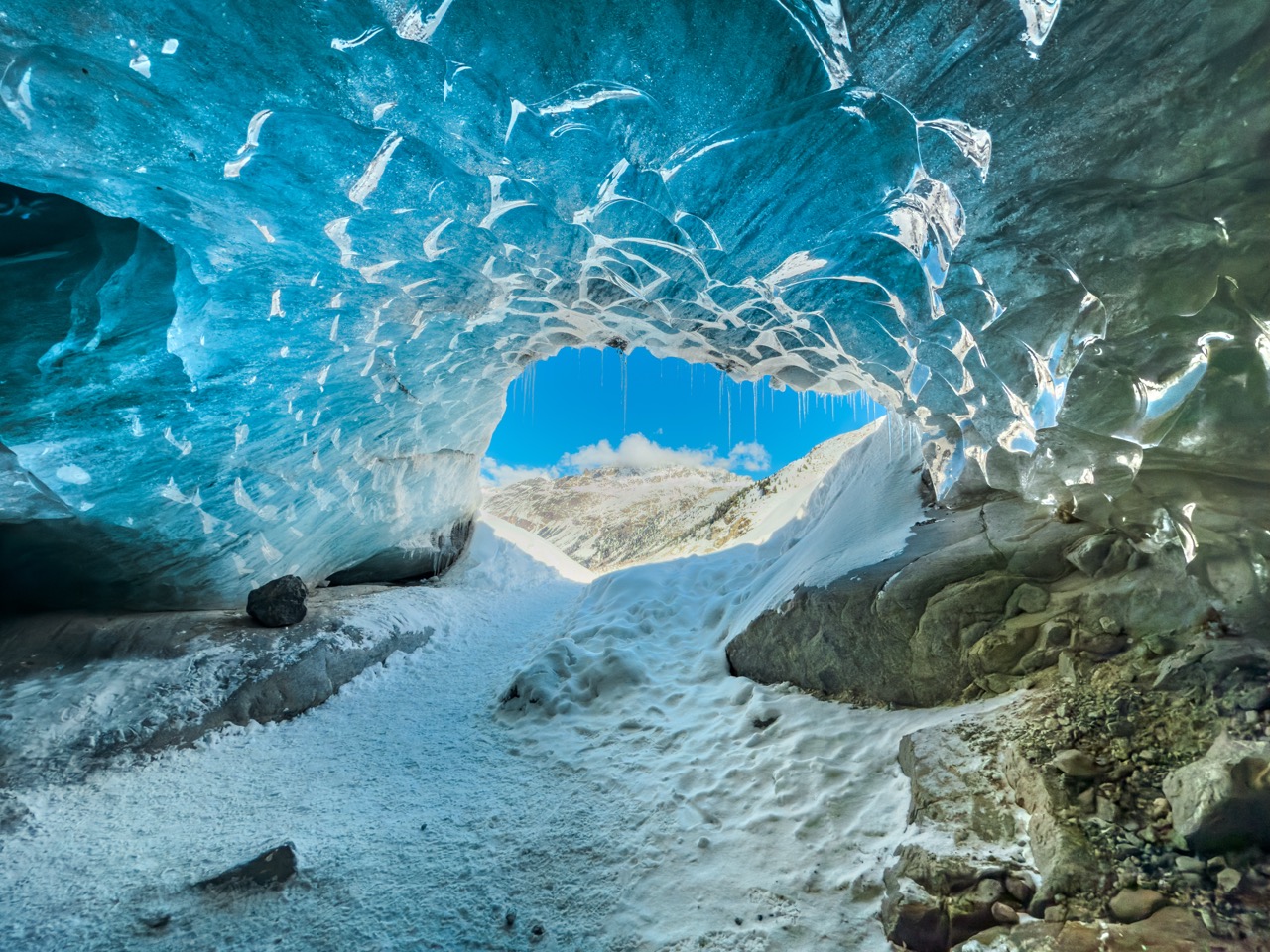 Faszination pur! Aber die muss man sich bekanntlich verdienen. Mit einer halben Stunde Verspätung startete ich zu den rund 6,5 km die in etwa vor mir lagen. Das Thermometer zeigte -8°C. Nach kurzer Zeit bildeten sich die ersten Eisklumpen in meinem Bart. Ups! Ich wusste es! Ich hätte die Schneeschue mitnehmen sollen. Doch die lagen gemütlich im Auto. Doch hier war kein Durchkommen. In der Nacht hat es so heftig geschneit, dass sich rund ein halber Meter Neuschnee gebildet hat. Ich versuchte trotzdem mein Glück. Und schon stand ich bis zu den Knien im Tiefschnee. Ich hatte also zwei Möglichkeiten: Mich für rund einen Kilometer durch den Schnee kämpfen, oder die Schneeschuhe holen. Ich entschied mich für letzteres. Das Lustige daran. Kaum war ich oben angelangt, sah ich, dass es etwa 100m neben meiner Route eine präparierten Weg gab. Ich gebe zu, kurz hab ich geflucht. Und dennoch. Es war ein wunderbarer Aufstieg. Die Belohnung war dann dieses Wunder der Natur. Eine Höhle die unter dem Gletscher verlief. Wie immer bei solchen Unterfangen: Achtet auf eure Sicherheit.